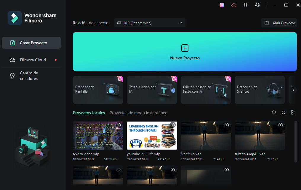 Nomes obrir Filmora t’ofereix un conjunt de projectes: