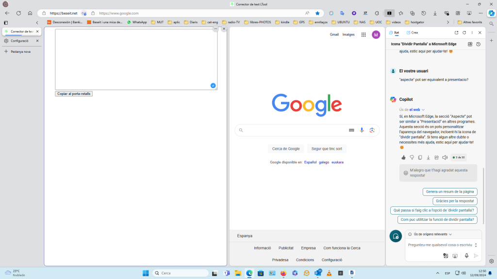 Documento aquesta divisió de pantalla que personalment la trobo útil: Pestanyes Verticals, aplicació correctora que estic provant (LanguageTool), una pàgina, en aquest cas (beseit.net) i Copilot. La divisió de pantalles és far en settings/presentació/divisió de pantalla.
