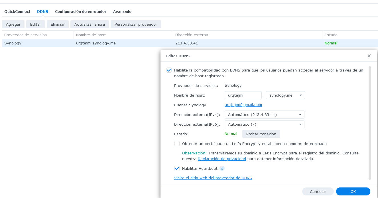 - Al DSM pots configurar-lo automàticament sota Control Panel > External Access > DDNS