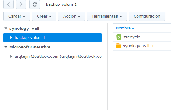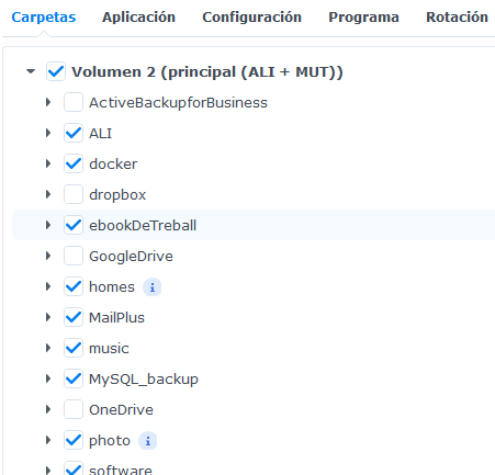 El disc “backup volum 1” està introduït a la bahia 1 (ve del DS918+ que automàticament ha fet una migració). EL SISTEMA ARRANCA amb aquestes carpetes: