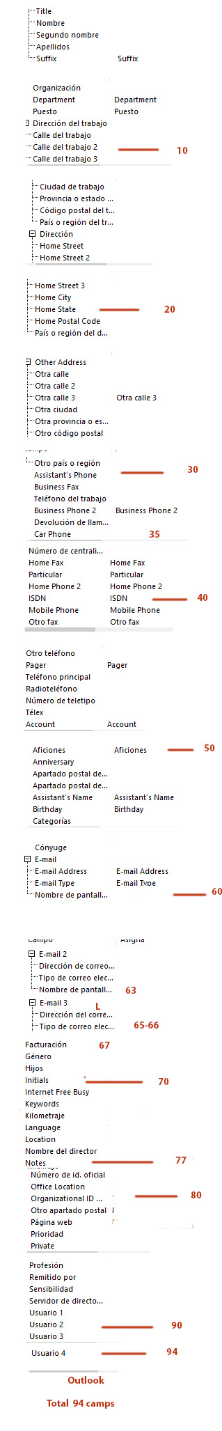 “Title”,” Nombre”,” Segundo nombre”,” Apellidos”,” sufix”,” Organizacion”,” Departament”,”Puesto”,” calle del trabajo”,” calle del trabajo 2″,” calle del trabajo 3″,” Ciudad de trabajo”,”Provincia o estado”,” Código postal”,” País”,” Home street”,” Home street2″,” Home street3″,”Home City”,” Home State”,” Home Postal code”,” País”,” Telefono del trabajo”,” Home phone”,”notes”,” direcion de correo1″,”direcion de correo2″,”direcion de correo3″,”direcion de correo4″