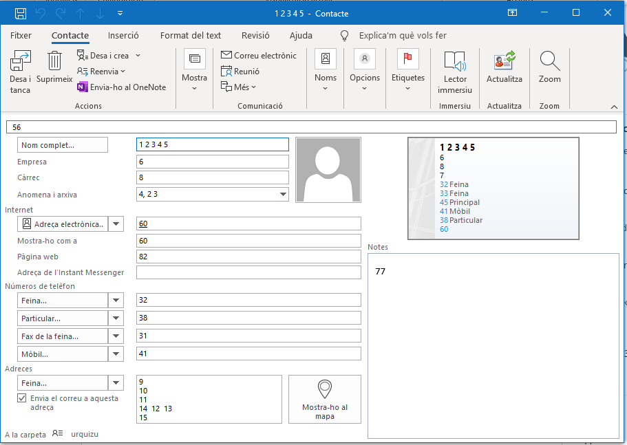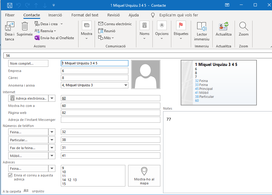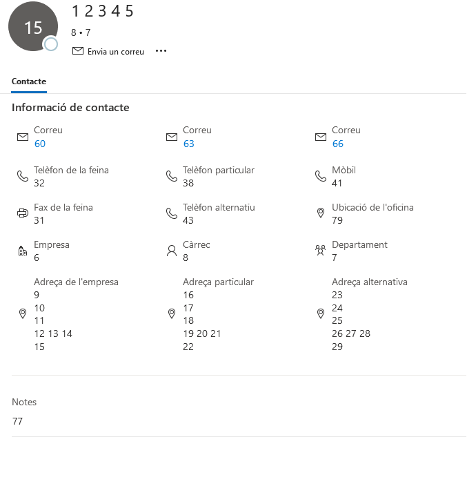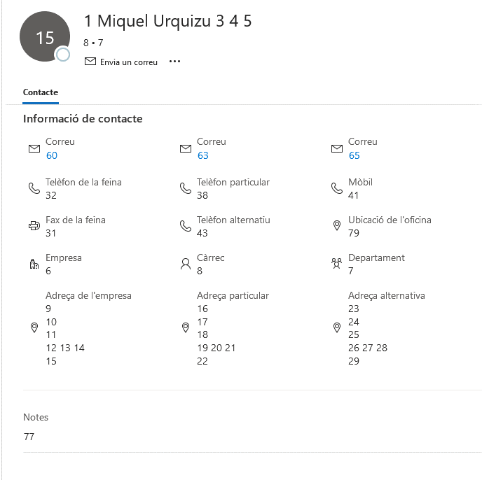 La taula de contactes de Outlook 365 té un total de 92 camps. L’aplicació contactes permet gestionar aquesta taula de registres (cada registre és un contacte), ja sigui a mà o important els contactes.