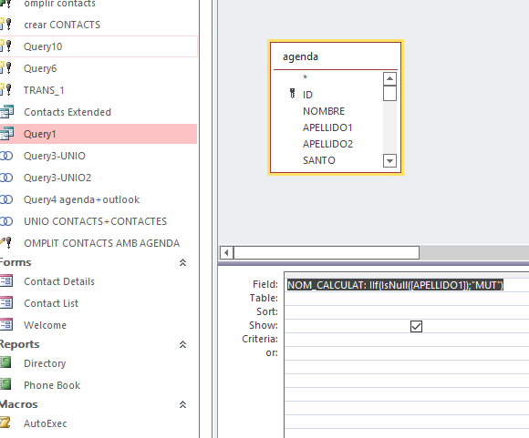 Queries amb camps calculats Publicat el 3 abril 2022 per admin NOM_CALCULAT: IIf(IsNull([APELLIDO1]);”MUT”) NOM_CALCULAT: IIf(IsNull([APELLIDO1]);IIf(IsNull([NOMBRE]);[EMPRESA];[NOMBRE]);IIf(IsNull([NOMBRE]);[APELLIDO1];[APELLIDO1] & ", " & [APELLIDO2] & ", " & [NOMBRE]))