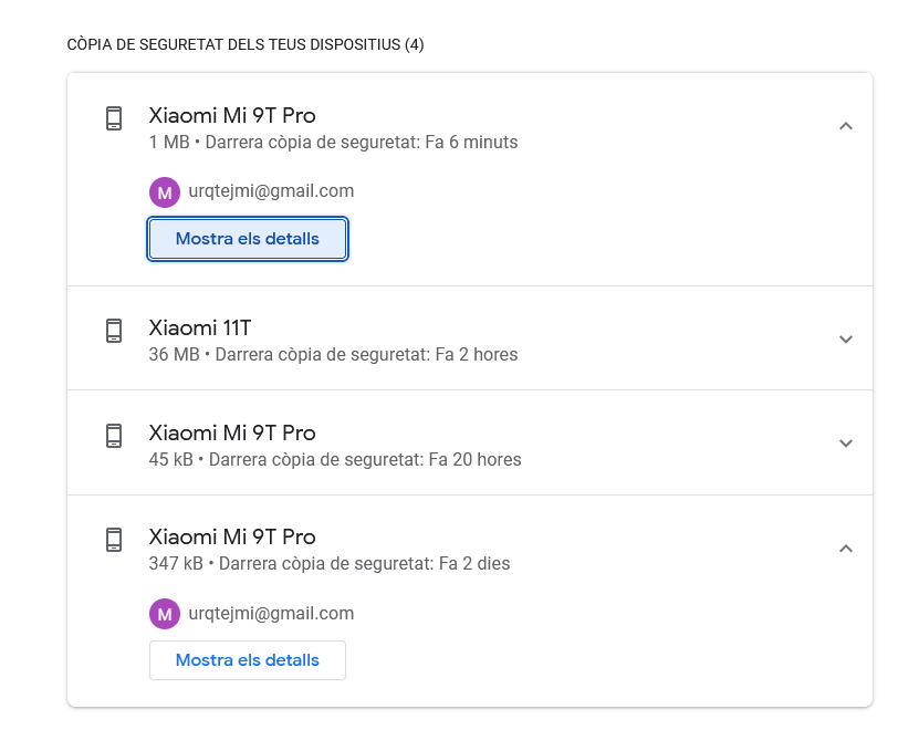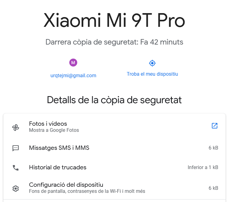 De quins elements pots crear una còpia de seguretat: Dades del dispositiu, missatges i fitxers adjunts MMS, i fotos i vídeos. Observem que també hi ha la funció troba el meu dispositiu