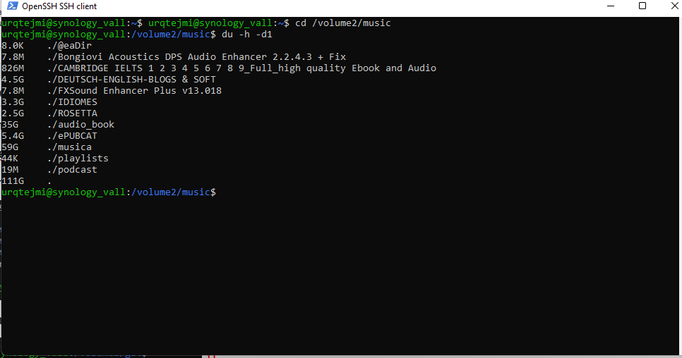El comandament du -h -d1 mostra l’espai ocupat dintre del directori sel·leccionat (en aquest cas “music”)