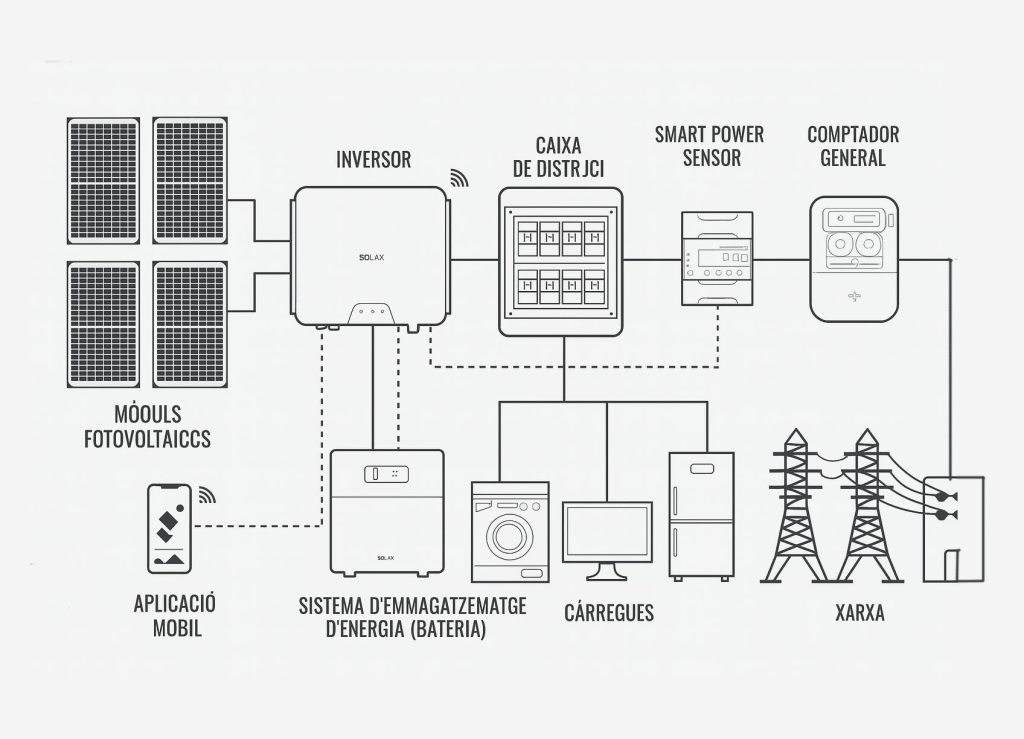 També veig que hi ha un SMART POWER SENSOR (sensor intel·ligent de potència) i un CONTADOR GENERAL connectats a la xarxa. Aquests dispositius són clau en un sistema híbrid, ja que permeten al sistema saber quanta energia està consumint la casa i quanta està disponible de la xarxa o de la bateria.