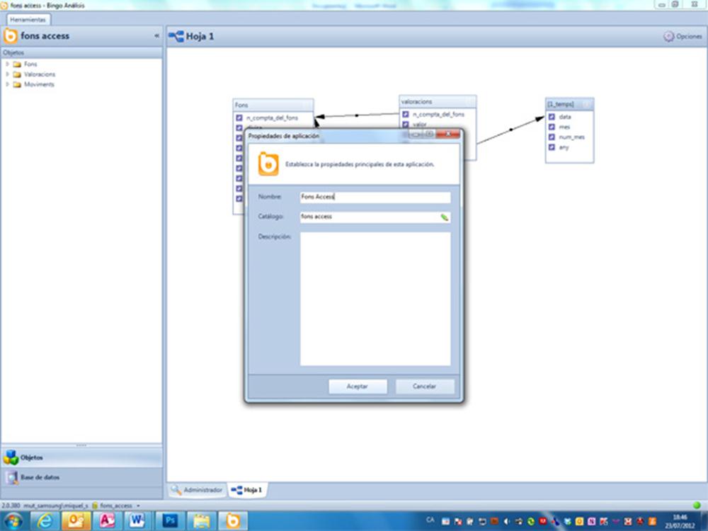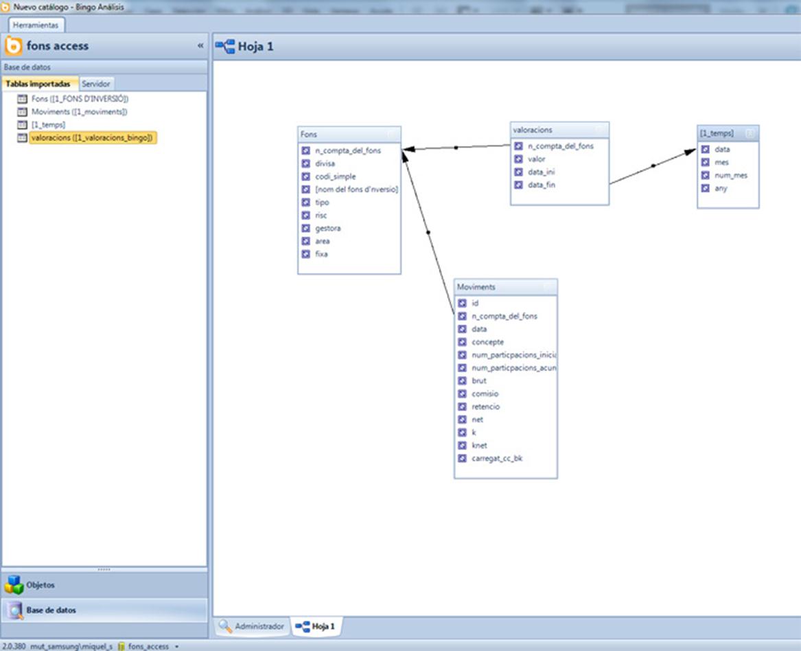 Una vegada connectats automàticament, Bingo mostra totes les taules de la BD (tenint clicada la pestanya servidor) dintre de un catàleg. Aquest ens permet vore totes les taules i les seves relacions.