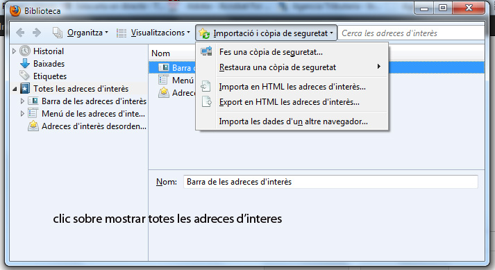 Importar adreces d’altres navegadors. aquesta opció està una mica amagada. hi ha que fer doble clic mostra totes les adreces d’interès.Adjunto finestra