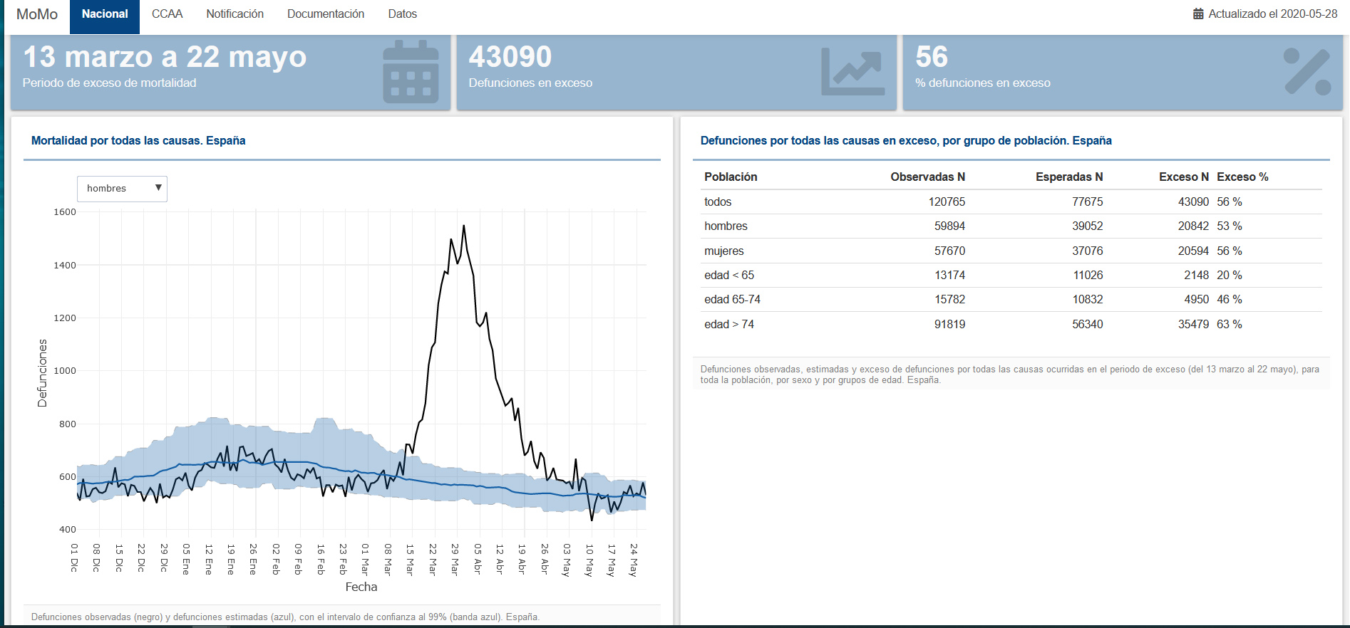 Els registres civils calculen que entre el 17 de març i el 22 de maig hi va haver 43.034 morts més que no pas les previsions inicials del Centre d’Epidemiologia espanyol, una quantitat que s’ha d’atribuir bàsicament a la pandèmia. Aquesta xifra és molt superior a la que recull oficialment el Ministeri de Sanitat espanyol.