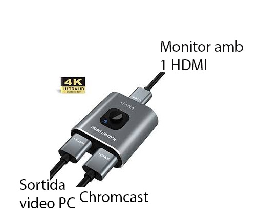 Qualsevol monitor d’un PC pot fer de TV si disposa de altaveu propi o té una sortida d’àudio i disposa de dos entrades de vídeo una HDMI per a connectar un Chromcast i l’altra lògicament l’ordinador. En el cas de que disposi només d’una, com és el cas Benq 2780, es pot solucionar amb un switch com el que es veu a la imatge. Hi ha un commutador manual que permet selecciona l’entrada 1 o 2 cap el monitor.